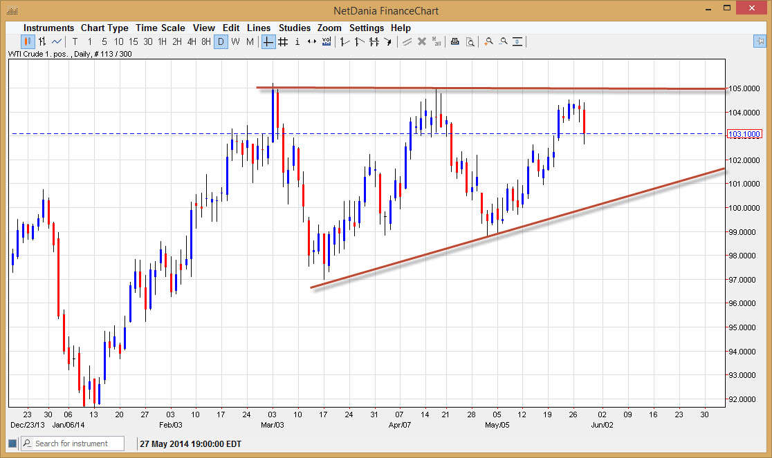 Il bello del triangolo ascendente è che può essere misurato, e ci fornisce un target a cui aspirare. Con una rottura al di sopra del livello $105 ritengo che il mercato del greggio WTI si dirigerà verso il livello $113, ma non significa necessariamente che accadrà nel giro di una notte. Ritengo che sarebbe una di quelle occasioni in cui si riesce a comprare sui cali su ogni rottura, fino alla maniglia del $113. Credo sarà un mercato molto positivo,nel quale tornerà di tanto tin tanto per fare profitti nel breve periodo, utilizzando il grafico più grande come quadro di riferimento.