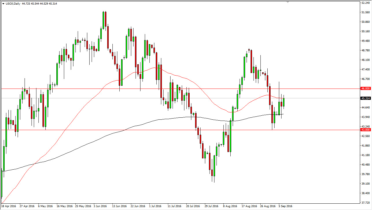 Il mercato del petrolio greggio WTI ha oscillato nel corso di mercoledì, mentre continuiamo a rimbalzare. Il livello 46$ al di sopra fornisce molta resistenza, proprio come il livello 43$ fornisce supporto. A questo punto, il mercato sembra procederà nel complesso lateralmente, ma visto che oggi avremo i dati sulle scorte di petrolio greggio, probabilmente vedremo qualche tipo di movimento decisivo. Personalmente, sto aspettando di rompere questo intervallo di trading, prima di investire denaro in questo mercato. Penso che la fine della giornata dovrebbe essere molto interessante.