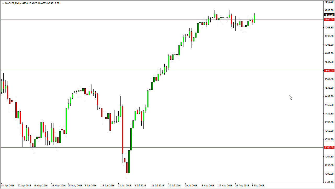Lo S&P 500 è sceso inizialmente durante la giornata di martedì, per poi rimbalzare abbastanza da formare un martello. Si tratta chiaramente di un segnale positivo, e ad ogni pullback abbiamo trovato acquirenti, per questo credo che alla fine romperemo al rialzo. Personalmente ho un target di 2.250 nel tempo, e credo che ora non si possa vendere. Dopo tutto, gli investitori in borsa stanno iniziando ora a pensare che non vedranno molti aumenti dei tassi, cosa che farà salire il valore dei titoli americani perché semplicemente le obbligazioni non avranno una resa..