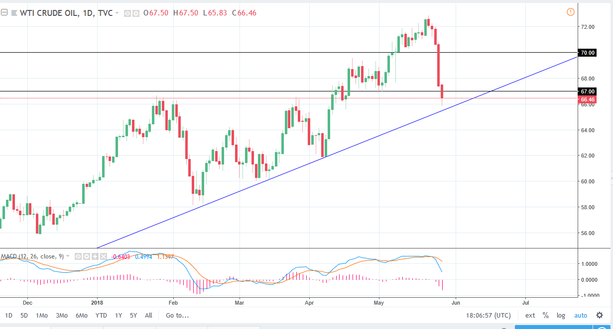 Il prezzo del greggio negli Stati Uniti è diminuito significativamente durante il giorno di lunedì, scendendo al di sotto del livello di 67 dollari. La liquidità avrebbe potuto essere migliore, naturalmente, dato che era il Memorial Day negli Stati Uniti. Di seguito è riportata una linea di tendenza rialzista enorme che dovrebbe continuare a mantenere gli acquirenti interessati a questo mercato. Abbiamo assistito a una svolta importante in questo mercato, ma penso che se possiamo rimanere al di sopra di questa linea di tendenza rialzista, è probabile che il prezzo del petrolio continuerà a salire nel tempo. Mi aspetterei un movimento sopra il livello di 67, prima di mettere i soldi per lavorare verso l'alto. D'altro canto, se scendiamo al di sotto del livello 65, sarò più che disposto a iniziare a vendere questo mercato, con un obiettivo almeno a 62 dollari. Penso che le prossime 2 sessioni saranno cruciali per la tendenza.