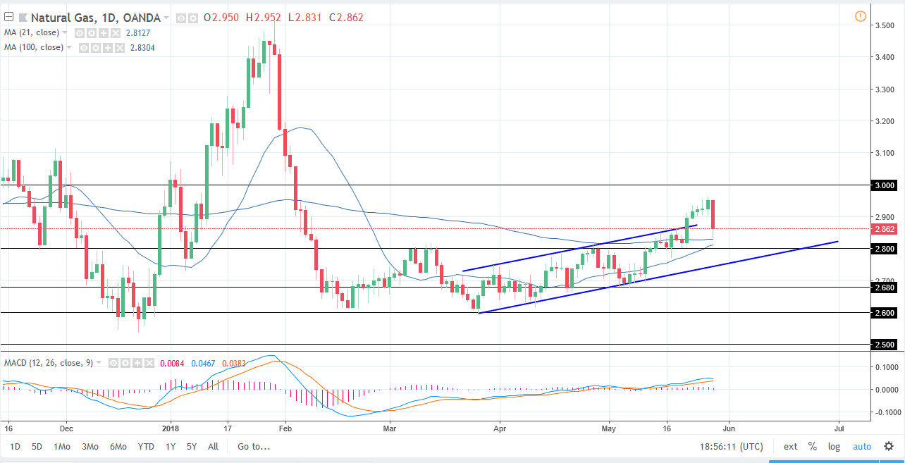 I prezzi del gas naturale sono scesi significativamente durante la sessione di martedì, perforando il livello di 2,90 $ come se non fosse mai esistito. Alla fine della sessione in America, avevamo perso il 3%. Ciò era dovuto alle temperature più morbide previste per le prossime 2 settimane e ciò, naturalmente, riduce la domanda di gas naturale per l'aria condizionata. C'è una quantità significativa di supporto al livello di 2,80 $, quindi ha senso che facciamo un leggero rimbalzo da lì. Tuttavia, penso che se rompessimo sotto 2,80 $, il mercato probabilmente cadrà nella linea di tendenza rialzista vista nel grafico e forse cadrà anche di più. Penso che, a questo punto, potremmo avere un rimbalzo e una ripresa a breve termine, quindi se hai inclinazioni a breve termine, potresti avere l'opportunità di acquistare gas. Tuttavia, come ho detto, penso che sia solo una questione di tempo prima che inizi la vendita. Francamente, non avevamo la candela esauriente che mi aspettavo di vedere per iniziare a vendere. Potremmo dover guardare i tempi più brevi per ottenere questo rimbalzo.