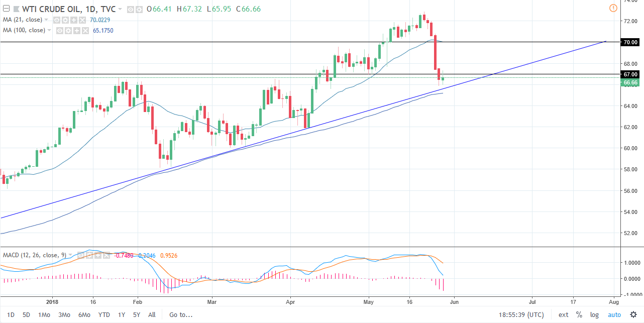 Martedì il prezzo del petrolio greggio statunitense è passato senza direzione, rispettando la linea di tendenza rialzista a più lungo termine e la media mobile semplice a 100 giorni. Penso che gli acquirenti probabilmente entreranno in questo mercato e cercheranno un qualche tipo di valore, dal momento che hanno rinunciato a gran parte dei profitti che avevano fatto di recente. Mi piace l'idea di acquistare i cali e penso che sia solo una questione di tempo prima che la manifestazione continui. Tuttavia, se chiudiamo sotto il livello di 66 dollari su un grafico giornaliero, penso che in quel momento probabilmente cadremo molto più in basso. Si dice che il taglio alla produzione si sia fermato e, naturalmente, il dollaro si sia rafforzato, ed entrambi sono fattori al ribasso. Tuttavia, c'è ancora molta tensione in Medio Oriente per sollevare questo mercato.