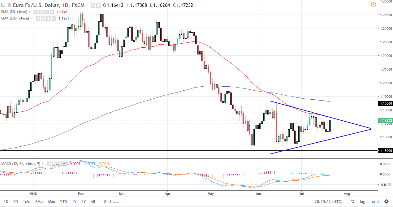 Inizialmente, la coppia EUR/USD si è leggermente abbassata durante il giorno di venerdì, ma si è voltata per esplodere verso l'alto. Ora, ho disegnato un paio di linee di tendenza per delineare un triangolo simmetrico che penso stia iniziando a entrare in gioco. Se riusciamo a rompere più in alto, creando sensibilmente un nuovo e fresco massimo, allora il mercato andrà probabilmente al livello di 1,1850, forse persino al livello di 1,20, che è ancora più resistente. Tuttavia, fino a quando non usciamo da questo triangolo simmetrico, non sono disposto a fare trading su questo mercato perché penso sia semplicemente troppo rumoroso, specialmente con il teatro politico in corso nell'Unione Europea e, naturalmente, il tweet casuale del presidente degli Stati Uniti che si preoccupa di commercio e tassi di interesse.