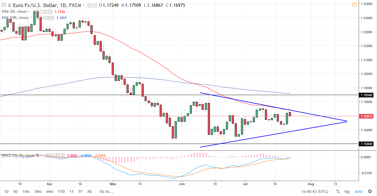 La coppia EUR/USD ha inizialmente tentato di rafforzarsi durante la sessione di trading di lunedì per iniziare la settimana, ma ha avuto problemi con l'EMA a 50 giorni, e ovviamente la linea di tendenza al ribasso che ho tracciato sul grafico. Sembra che ci stiamo consolidando in un triangolo simmetrico, e credo che questo triangolo continuerà a essere un problema in questo mercato, e ha anche un certo senso, perché ci sono così tanti problemi là fuori che potrebbero muovere il dollaro USA. Ovviamente, anche la situazione politica nell'Unione europea è un problema importante. Credo che la cosa migliore da fare in questo mercato sia aspettare una chiusura giornaliera al di fuori del triangolo simmetrico, e quindi puntare a una delle due linee nere che ho nel grafico, al livello di 1,15 al ribasso o al livello 1,1850 al rialzo.