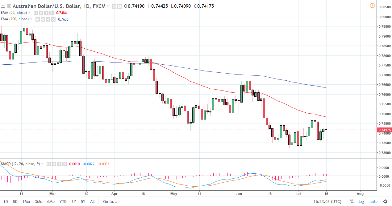 Il dollaro australiano ha tentato inizialmente di rafforzarsi durante il giorno di lunedì, ma ha restituito i guadagni. Il livello di 0,7450 sopra sembra completo, e sembra che anche il livello di 0,75 sia più resistente, soprattutto considerando che l'EMA a 50 giorni si trova nella stessa zona. Credo che il mercato abbia anche molto supporto vicino al livello di 0,7350. Per questo motivo, prevedo molte azioni laterali avanti e indietro, forse in qualche tipo di churning. Complessivamente, i grafici settimanali mostrano alcuni martelli, e questo ovviamente è un segnale rialzista e potremmo provare a mettere un po’ di “pavimento” vicino al livello di 0,7350. Tuttavia, in questo momento il mercato è un po’ ristretto, quindi penso che ci sarà un sacco di trading avanti e indietro nel prossimo paio di sessioni. Abbiamo i nostri livelli da osservare e ora abbiamo bisogno che il mercato rompa uno di essi.