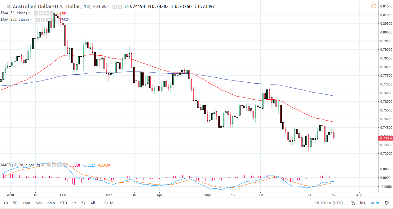 Il dollaro australiano si è inizialmente rafforzato durante la sessione di negoziazione di martedì, ma ha trovato troppa resistenza al livello di 0,7450 per continuare ad andare più in alto. Siamo caduti e siamo andati sotto il livello 0,740 per continuare ancora una volta il consolidamento. Penso che il mercato continuerà ad andare avanti e indietro e tenterà di costruire un qualche tipo di modello di fondo basato sui martelli settimanali che sembrano suggerire il livello di 0,7350 come una delle principali aree di domanda a più lungo termine. Fino a quando non avremo una chiusura giornaliera sopra l’EMA a 50, segnata in rosso sul grafico, non penso che lo slancio si sposterà significativamente al rialzo. Altrimenti, se scendiamo al di sotto del livello di 0,7350, il mercato probabilmente raggiungerà il livello di 0,72, seguito dal livello di 0,70 a più lungo termine.