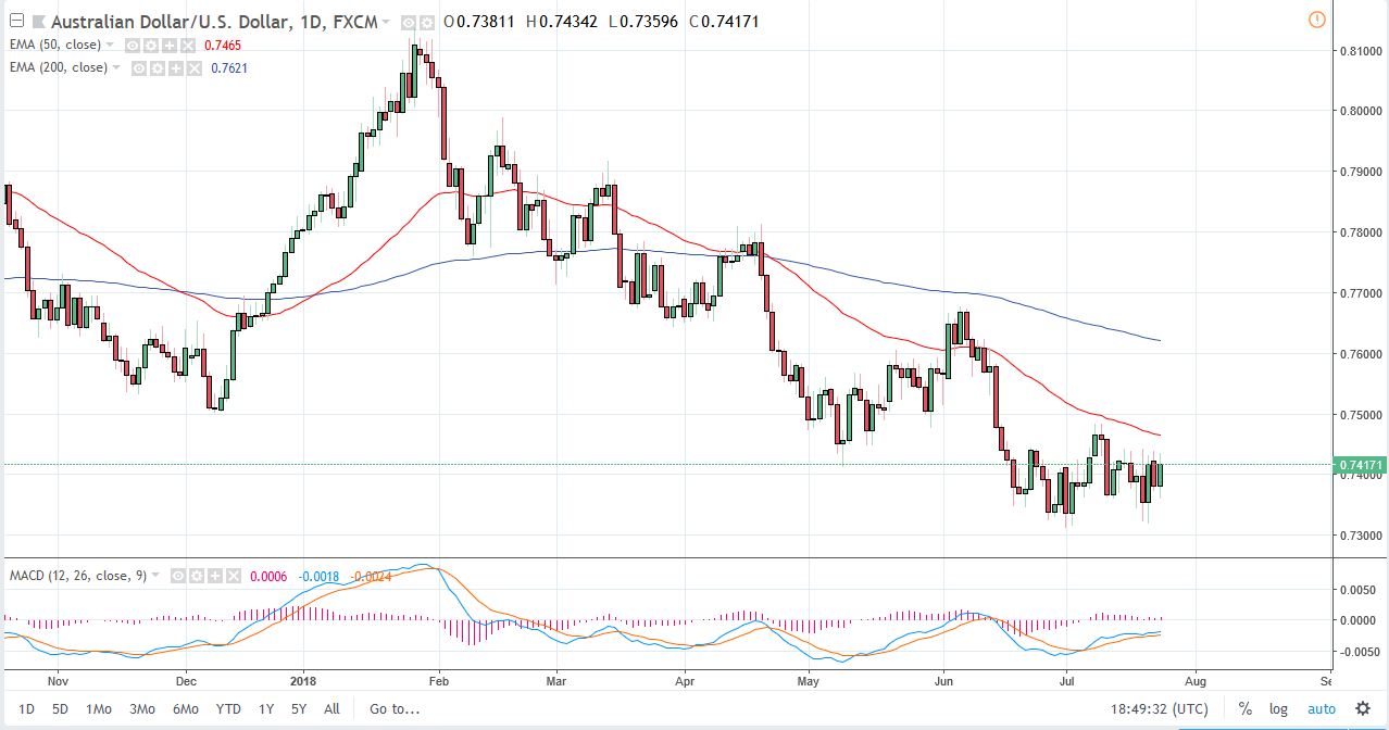 Il dollaro australiano ha recuperato un po’ durante la giornata, mentre continuiamo a rimbalzare intorno al livello di 0,73, superando il livello di 0,74. Credo che il mercato alla fine cercherà di rompere al rialzo, ma dobbiamo vedere il dollaro australiano eliminare il livello di 0,75, e a questo punto non penso che possa accadere a breve termine. Per questo motivo, penso che dovreste cercare dei pullback a breve termine per sfruttare il valore, dal momento che il grafico settimanale conteneva diversi martelli, che a mio avviso stanno mostrando una buona base. In definitiva, se scendessimo al di sotto del livello 0,73, sarebbe un segnale molto negativo, che forse invierebbe questo mercato a livelli molto più bassi. Se ciò accadesse, penso che potremmo scendere al di sotto del livello di 0,70. Se possiamo andare al rialzo, penso che il mercato andrà al livello di 0,77.