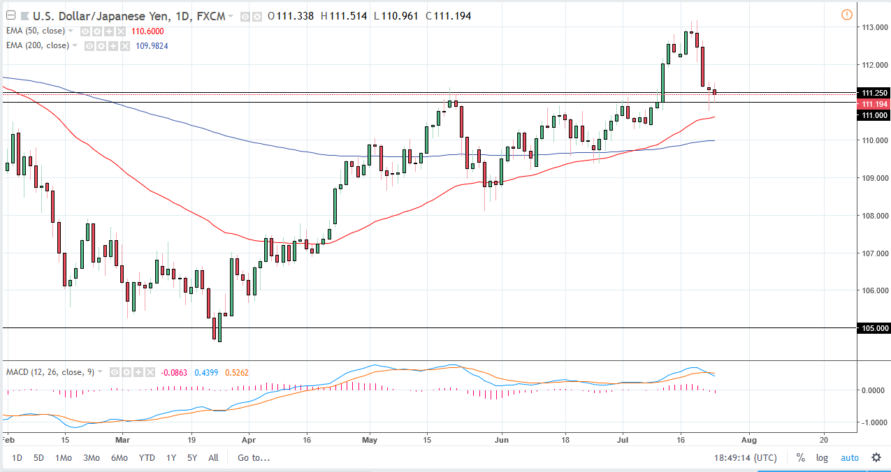 Il dollaro USA è caduto contro lo yen giapponese durante la sessione di negoziazione di martedì, ma continua a trovare supporto al di sotto del livello 111¥, dopo la formazione di un martello durante la sessione del lunedì. Credo che la domanda inizierà a salire in questa zona, offrendo l'opportunità di raccogliere il dollaro USA “a buon mercato” rispetto allo yen giapponese. Credo che il mercato si riprenderà andando verso il livello sopra di 113¥, ma ci vorrà un po’ di tempo per arrivarci. Nel complesso, il mercato troverà probabilmente molto rumore nel processo, dato che abbiamo visto così tanta vendita, ma chiaramente c'è molto supporto sotto. Oltre il livello, avete la EMA a 50 che incrocia l’EMA a 200, che è un segnale di “buy-and-hold” a lungo termine per alcuni trader.