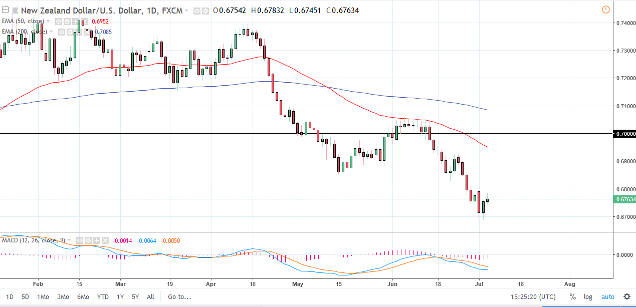 Il dollaro neozelandese non ha fatto quasi niente nella sessione di negoziazione di mercoledì, visto che è stata tolta al mercato tanta della sua liquidità, con gli americani che hanno celebrato la loro festività. Abbiamo cercato di rafforzarci al livello 0,68, ma abbiamo svenduto drasticamente e formato un po’ una shooting star. La shooting star è ovviamente una candela negativa, e penso che dimostri come staimo cercando di raggiungere il lato inferiore, forse andando di nuovo al livello 0,67. Se riusciamo a superare il livello di 0,68, il mercato potrebbe rimbalzare al livello 0,69 ma a quel punto penso che anche la EMA a 50 che si inserirà nel grafico giornaliero potrebbe offrire un po’ di resistenza psicologica. In altre parole, questo è un mercato di sola vendita, e sto cercando segni di esaurimento o di pressione negativa per ricominciare a vendere.