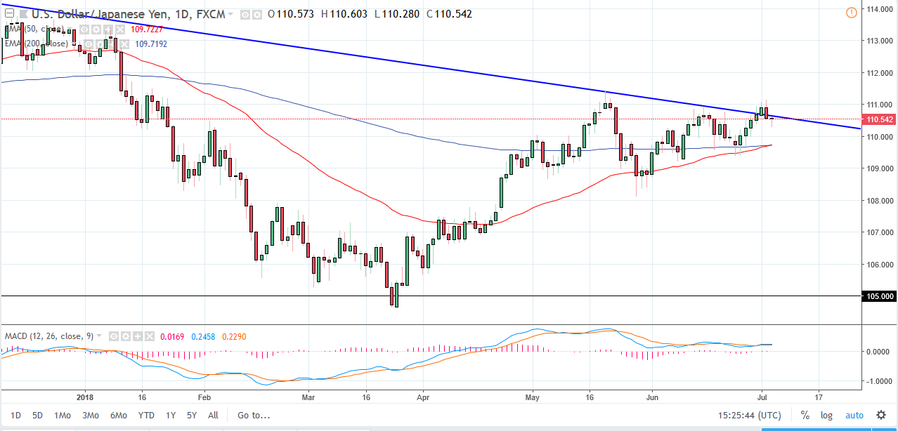 Il dollaro americano si è ritirato un po’ durante la sessione di negoziazione di mercoledì, dato che i commercianti americani erano via per il Giorno dell'Indipendenza. Credo che un rimbalzo nel modo in cui abbiamo visto e la formazione di un certo martello alla precedente linea di tendenza ribassista suggerisce che ne faremo un altro al livello di 111¥, che ovviamente sarebbe un segnale molto rialzista nel caso in cui riuscissimo a superarlo. Tenete presente che questo mercato è straordinariamente sensibile alla propensione al rischio e, naturalmente, ai titoli di notizie che escono sia dagli Stati Uniti sia dalla Cina, quindi se avessimo qualche tipo di shock, questo mercato potrebbe muoversi all'improvviso. In questo momento, tuttavia, sembra che alla fine della giornata il dollaro USA stia cercando di aumentare la forza contro la maggior parte delle valute, e sembra anche che lo yen giapponese farà diversamente.