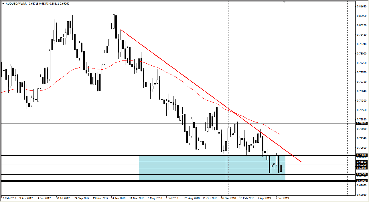 Il dollaro australiano ha recuperato leggermente durante la settimana, ma siamo ancora nell'area di consolidamento in cui ci troviamo da un po' di tempo. Il livello di 0.68 sotto è enorme nel suo supporto al mercato, proprio come il livello di 0.70 sopra è una grande resistenza. Questo è un mercato che è tenuto in ostaggio dai colloqui commerciali USA / Cina, quindi dovremo aspettare e vedere come si evolverà, dato che il mercato aumenterà o diminuirà a seconda di come vanno questi colloqui. Probabilmente sarà meglio evitare questa coppia, o supponendo che stiamo andando a colpire avanti e indietro.