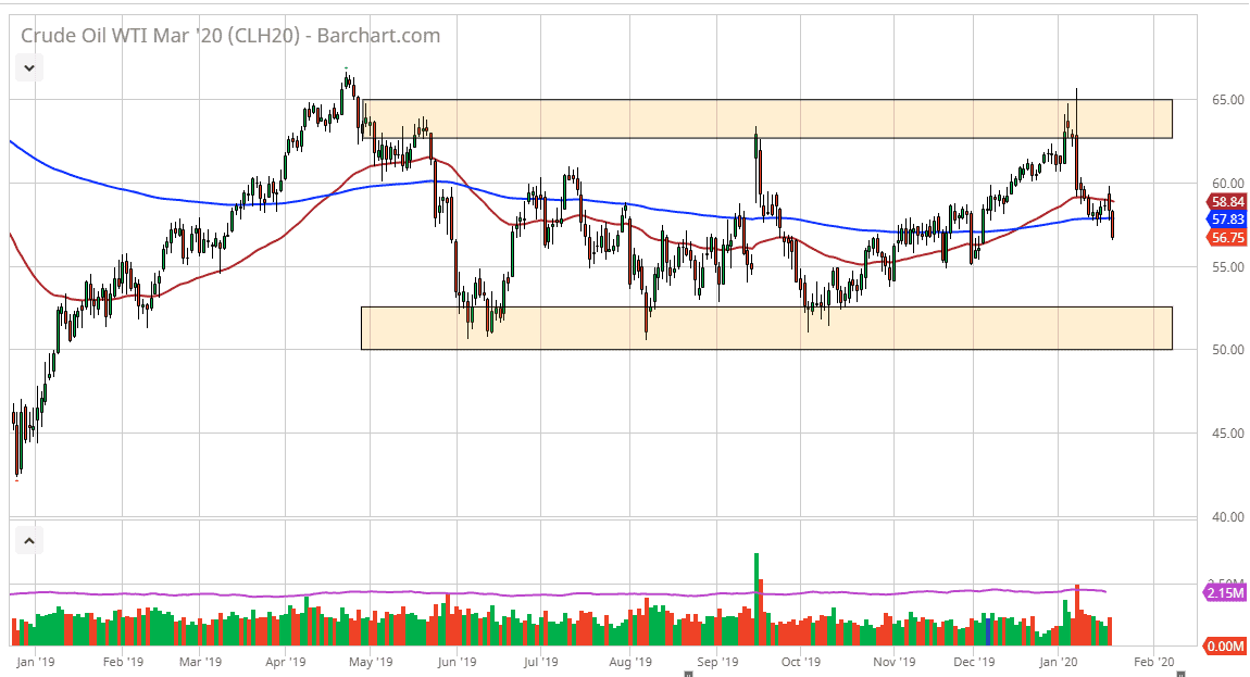 Il quadro più ampio è quello per cui negli ultimi mesi ci siamo consolidati tra il livello dei 65 dollari e il livello dei 50 dollari; in altre parole, non sarebbe una grande sorpresa vedere questo mercato continuare a spostarsi verso il basso, e sebbene possa sembrare molto negativo a breve termine, la realtà è che si tratterebbe di una semplice continuazione del trading globale legato all’intervallo visto per qualche tempo. La media mobile esponenziale a 50 giorni sembra pronta a scendere sotto la media mobile esponenziale a 200 giorni, mostrando ulteriori segni di negatività. Inoltre, anche la candela formata nella sessione di trading sembra molto negativa e mostra segni di convinzione al ribasso, proprio nel momento in cui stiamo chiudendo verso il fondo dell’intervallo maggiore. La situazione fondamentale continua ad essere quella in cui permane una grave mancanza di domanda in generale, ma che vede allo stesso tempo l’OPEC cercare di ridurre la produzione. Tutto considerato, è ovvio che il mercato continuerà a vedere molta volatilità, ma penso dovremo tornare al ribasso prima di poter rimbalzare di nuovo. Il modo migliore per negoziare questo mercato è probabilmente venderlo da una prospettiva a breve termine sui segni di fallimento.