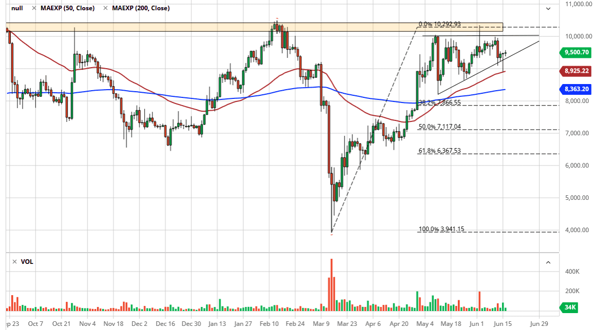 I mercati dei bitcoin hanno fatto straordinariamente poco durante la sessione di negoziazione di martedì, poiché i mercati erano ovunque fuori dal mondo delle criptovalute. Il mercato dei Bitcoin si è ripreso piuttosto bene negli ultimi mesi e penso che stiamo semplicemente cercando di digerire tutti i guadagni, dato che stiamo formando un pò di un triangolo ascendente. Il triangolo ascendente ha un tetto appena sopra tra il livello di 10.000 $ e il livello di 10.500 $. Sta attraversando quello che sarà estremamente difficile, ma se lo facciamo allora è molto probabile che il mercato continui a correre al rialzo.