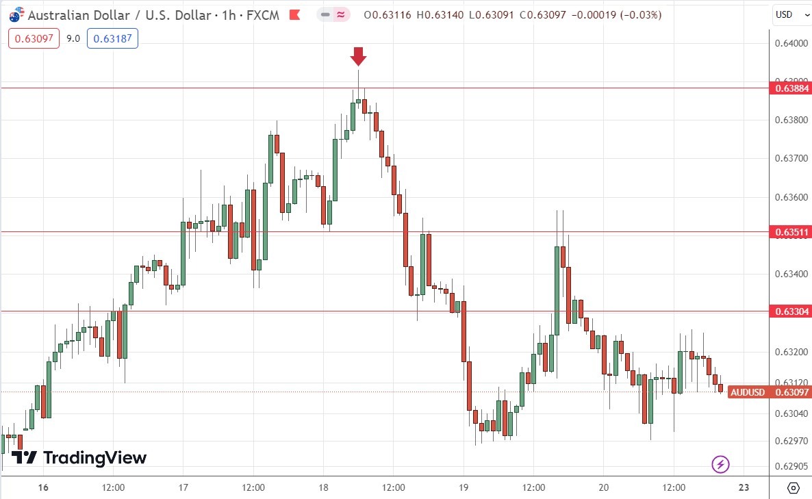 La scorsa settimana mi aspettavo che il livello di 0,6388$ potesse fungere da resistenza nella coppia di valute AUD/USD, poiché in precedenza aveva agito sia come supporto che come resistenza. Da notare come questi livelli di “inversione di ruolo” possano funzionare bene. Il grafico dei prezzi a H1 qui sotto mostra come il prezzo abbia rifiutato questo livello proprio all'inizio della sessione londinese di mercoledì scorso (che può essere un ottimo momento per entrare in operazioni nelle principali coppie di valute come questa) con una grande barra pin, contrassegnata dalla freccia giù nel grafico dei prezzi qui sotto che segnala i tempi di questo rifiuto ribassista. Questa operazione è stata molto redditizia, offrendo un rapporto rendimento/rischio massimo di circa 7 a 1 in base alla dimensione della candela di ingresso.