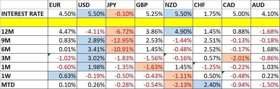 Esaminiamo i dati pertinenti sulle variazioni dei prezzi delle valute e sui tassi d'interesse ad oggi, che abbiamo compilato utilizzando un indice ponderato per il trading delle principali valute globali: