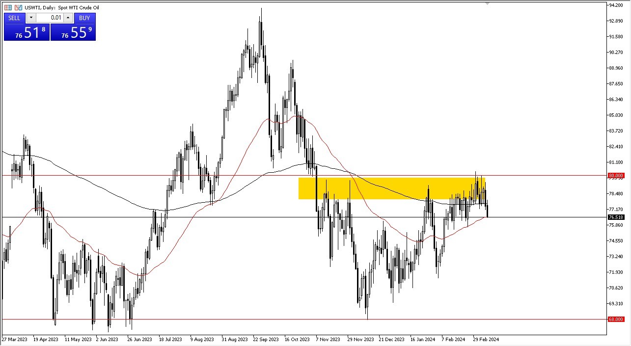 Il prezzo del petrolio greggio WTI è sotto esame e, come potete vedere, ci stiamo muovendo intorno alla EMA a 200 giorni e alla EMA a 50 giorni nel tentativo di mostrare qualche segno di vita. Credo ancora che il mercato sia un acquisto al ribasso in questo momento. Sembra inevitabile che alla fine romperemo al rialzo puntando al livello di $80. Dobbiamo tenere d'occhio da vicino il livello di $80 poiché rappresenta una significativa resistenza. Se la superiamo, credo che il mercato rimbalzerà con forza.