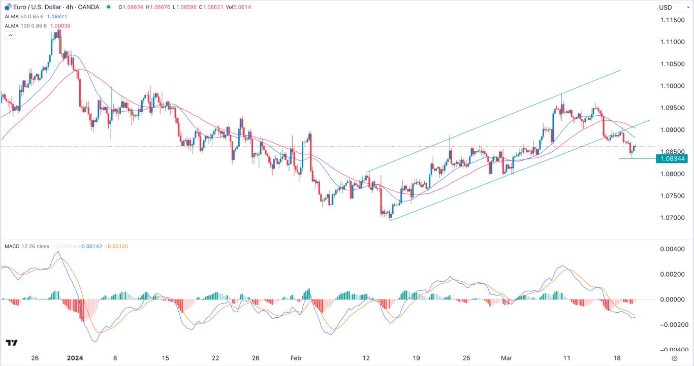 La coppia EUR/USD si è ritirata mentre gli investitori anticipavano una possibile divergenza tra la Federal Reserve e la Banca Centrale Europea (BCE). È scivolata fino a un minimo di 1.0834, il punto più basso da marzo 6.
