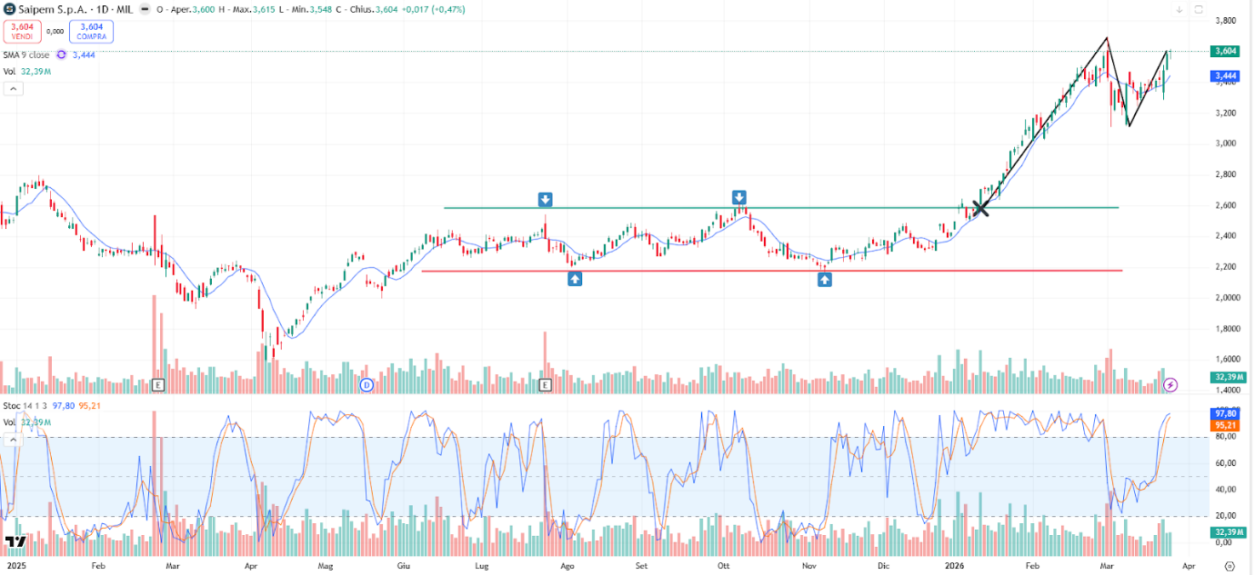 Dopo un 2025 strutturalmente debole il 2026 è iniziato in modo convincente e la parziale correzione dovuta allo scoppio della guerra in Iran è già stata assorbita, se solo pensiamo che da inizio anno il rendimento di Saipem registra un convincente +48%, veramente notevole, specialmente in questa situazione.